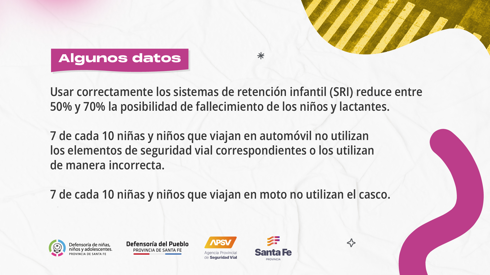 Entre los factores de riesgo de siniestros viales se encuentran la no utilización de cascos, cinturones de seguridad y sistemas de retención infantil (SRI). Si se instalan y se usan correctamente, los dispositivos de sujeción para niños reducen aproximadamente un 70% las muertes de lactantes, y entre un 54% y un 80% las de niños pequeños.